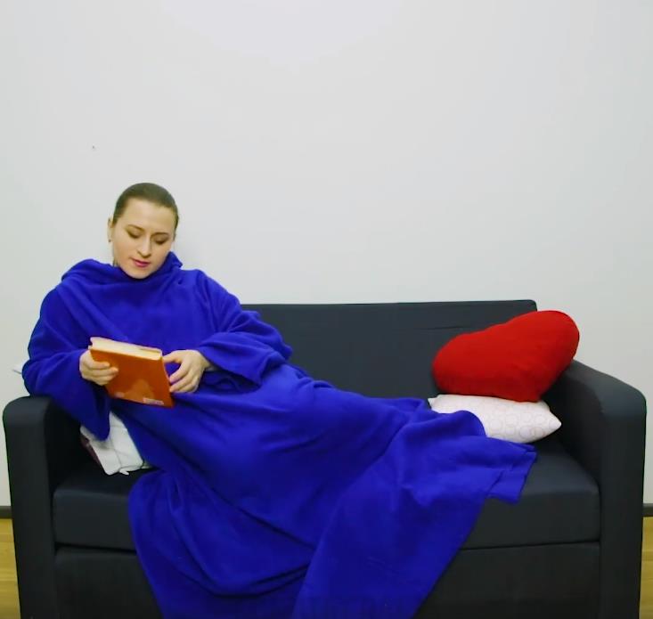 Lột ngược phần ống tay ra bên ngoài để giấu đường chỉ khâu đi. Vậy là chiếc chăn tuyệt vời này đã hoàn thành rồi. Lồng tay qua ống tay và trùm chăn lên người. Giờ thì bạn có thể thoải mái đọc sách mà không phải thò hai cánh tay ra khỏi chăn rồi.