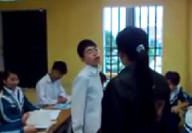 Nam sinh ưỡn ngực, vênh mặt cãi tay đôi với cô giáo. (Ảnh cắt từ clip được đăng tải trên mạng xã hội năm 2014)