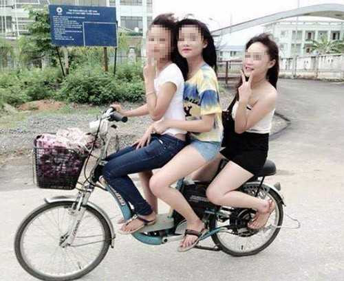 Những cô gái 9X mặc quần siêu ngắn, áo hở bụng, ngực, lưng cưỡi xe đạp điện cười nói ồn ào.