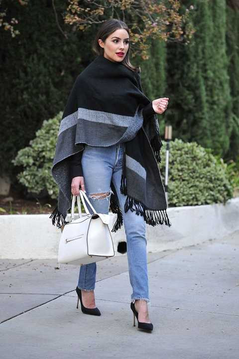 | Olivia Culpo biến khăn choàng dạ thành chiếc áo khoác vừa thời trang vừa rất ấm áp. |