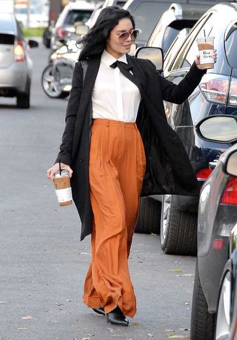 | Vanessa Hudgens thu hút mọi ống kính của paparazzi khi dạo phố West Hollywood. Cô nàng tạm gác phong các boho quen thuộc mà thay bằng bộ đồ thanh lịch: áo sơ-mi trắng cột nơ, quần palazzo cam và áo khoác dạ xám. |