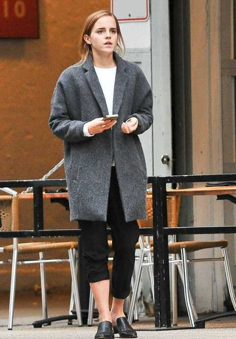 | Tương tự, Emma Watson mặc áo khoác dạ dài với áo thun trắng và quần xắn cá tính trên phố New York tuần này. Tông màu xám mang lại cảm giác ấm áp và chín chắn cho nữ diễn viên. |