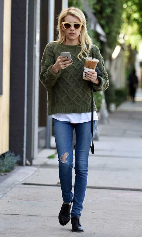 | Áo sweater cũng là một item không thể thiếu trong mùa thu đông. Emma Robert phối áo sweater theo phong cách layer cổ điển cùng áo thun trắng và quần jeans. |
