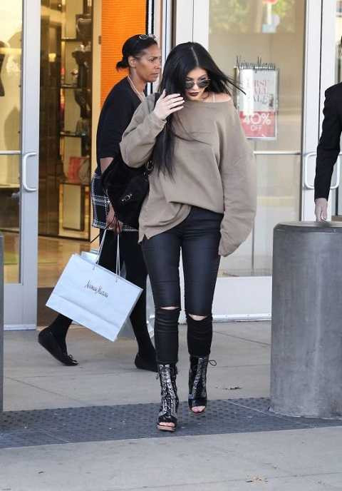 | Kylie Jenner bụi bặm khi mua sắm ở New Rolls Royce với áo sweater oversize và quần jeans skinny rách, bốt cột dây hở mũi. |
