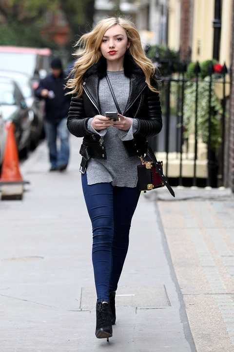 | Áo khoác da luôn được "sủng ái" vào mùa thu đông. Peyton List phối áo jacket da với áo thun và quần jeans giản dị dạo phố London. |