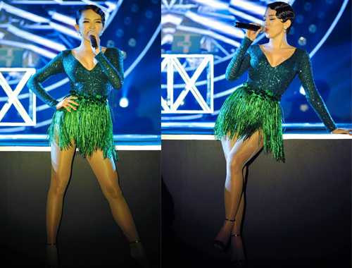 | Trong khi đó, trang phục của Tóc Tiên vừa có màu xanh tươi mát của Giáng Sinh vừa có độ lấp lánh của sequin khiến cô nổi bật trên sân khấu của Lễ trao giải POPS Awards 2015. |