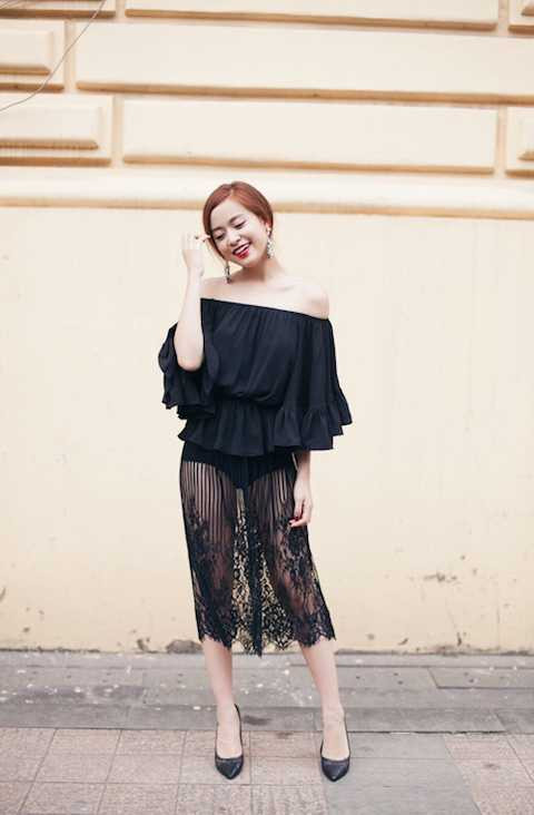 Trang phục kém tinh tế hiếm hoi của Hoàng Thuỳ Linh. Trong khi chiếc áo lệch vai rộng thùng thình che đi hết đường cong đáng tự hào thì chiếc váy ren lại khoe chân táo bạo khiến những người đi đường không khỏi lắc đầu.