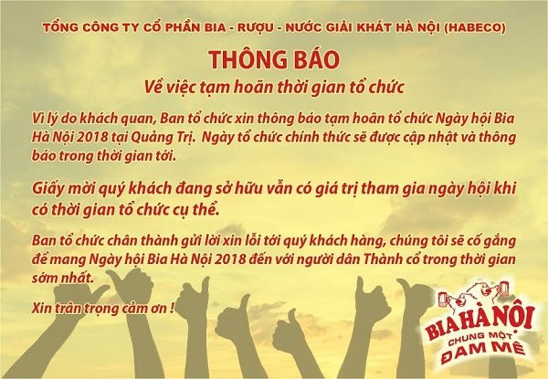 Đại diện ban tổ chức cũng chia sẻ: ‘‘Chúng tôi đã chuẩn bị mọi thứ sẵn sàng để sự kiện diễn ra vào cuối tuần này, tuy nhiên Bia Hà Nội rất tiếc phải thông báo sự kiện Ngày hội Bia Hà Nội 2018 sẽ buộc phải lùi thời gian tổ chức do sự cố bất khả kháng nằm ngoài tầm kiểm soát của chúng tôi. Chúng tôi rất tiếc về điều này và sẽ cố gắng hết sức để xác nhận lại ngày tổ chức mới. Chúng tôi muốn gửi lời xin lỗi chân thành tới những khách hàng đã nhận được vé tham dự Ngày hội.
