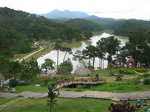 Ở những khoảnh đất bằng người ta dựng lên những căn nhà sàn cột gỗ để khách “Home Stay” qua đêm thấp thoáng cô gái chờ ai, bắc những chiếc cầu tre đủ chắc qua hồ sang hòn đảo nhỏ, những chiếc guồng nước hình bánh xe múc bằng ống bương đặt bên các dòng suối chầm chậm quay, những nhóm tượng gỗ đẽo vạc thô bằng rìu đặc trưng điêu khắc Tây Nguyên đặt rải khắp vùng. Tất nhiên không thể thiếu những quán ăn có rượu và thực phẩm sản vật địa phương và quán giải khát, kèm những loại mứt quả và các chế phẩm a-ti-sô nổi tiếng có lợi cho sức khỏe mà ai đến cũng mua vài cân dùng và làm quà.