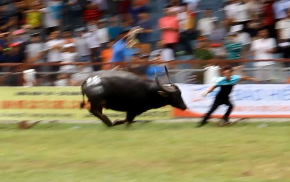 Trước khi húc chủ nhân, "ông trâu điên" đã đuổi húc chủ trâu đối phương, tuy nhiên người này đã chạy thoát. (Ảnh: Minh Khang)