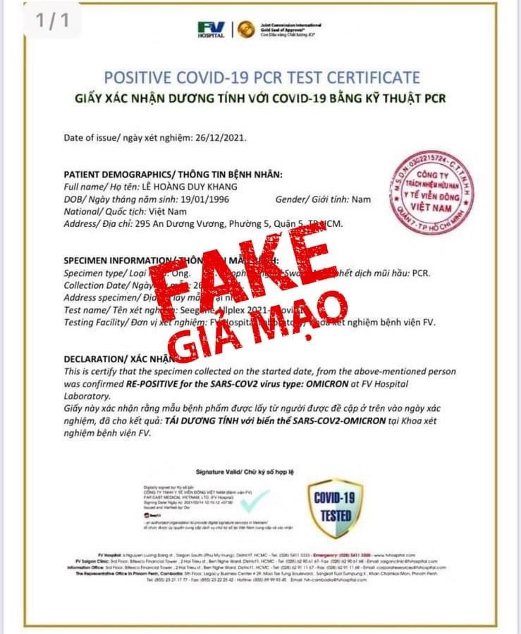 Trước đó, trên trang mạng xã hội Facebook xuất hiện hình ảnh một giấy xét nghiệm COVID-19 có đóng dấu của Công ty TNHH Y tế Viễn Đông Việt Nam (Bệnh viện FV) với nội dung "xác nhận" bệnh nhân tên K. (ngụ quận 5, TP.HCM) dương tính với biến chủng Omicron.