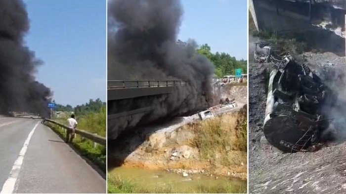 Sau va chạm, xe ôtô tải xitec tiếp tục đâm gãy lan can bên trái cầu Ngòi Thủ và rơi xuống khu vực gần cầu rồi bốc cháy.