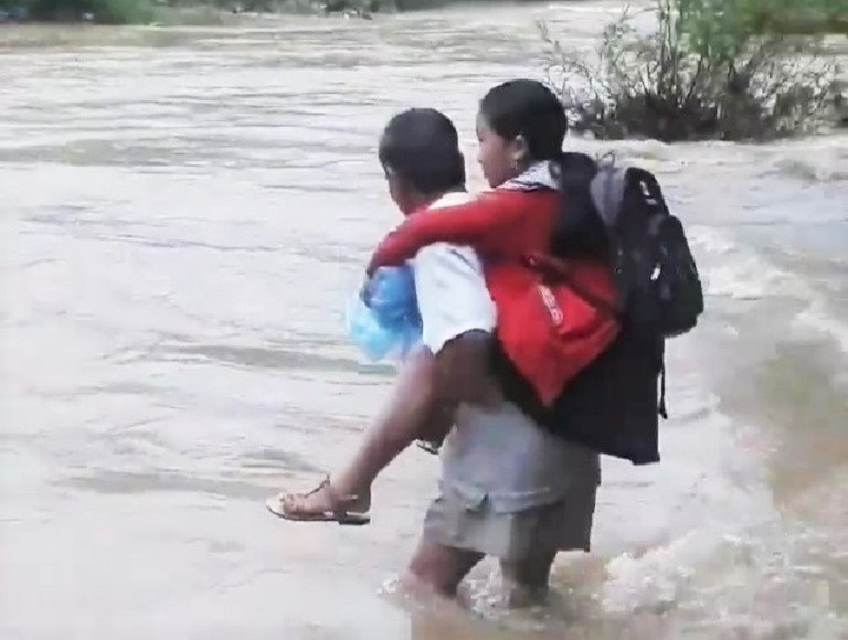 Clip dài hơn một phút cho thấy, người này bất chấp dòng nước đang chảy xiết, liều mình cõng bé gái vượt khúc sông với mực nước cao khoảng một mét.