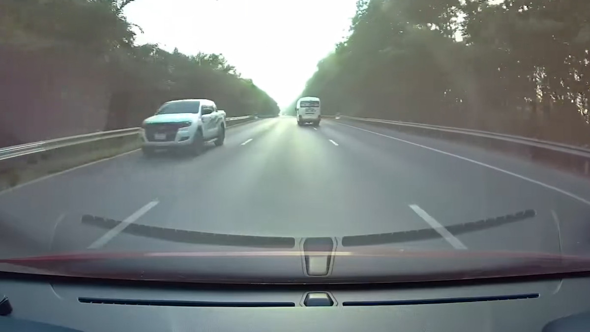 Các phương tiện đang lưu thông bất ngờ một xe bán tải chạy ngược chiều trên Đại lộ Thăng Long (Hà Nội) may mắn, các tài xế nhìn thấy và đánh lái kịp thời.