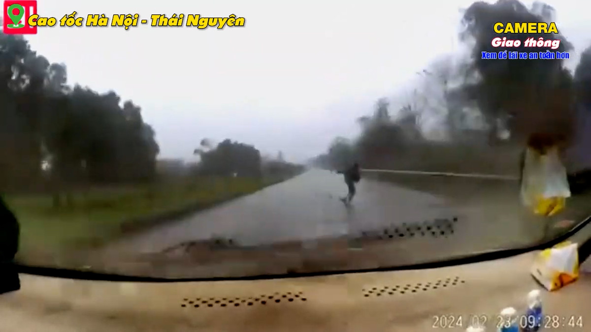 Người đi bộ thản nhiên sang đường trên cao tốc Hà Nội - Thái Nguyên khiến tài xế ô tô phải đánh lái gấp để tránh xảy ra va chạm.