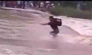 Tại đoạn ngầm xã Phú Nhuận, huyện Bảo Thắng, tỉnh Lào Cai, trong khi nhiều người dân chỉ dám đứng nhìn dòng lũ chảy cuồn cuộn thì một nam thanh niên đã bất chấp nguy hiểm vẫn băng qua dòng nước lũ.Dòng nước chảy mạnh khiến người thanh niên này trượt chân ngã và có thể bị dòng nước lũ cuốn đi. Tuy nhiên rất may người thanh niên này vẫn chạy được đến bờ.Vũ Nguyên