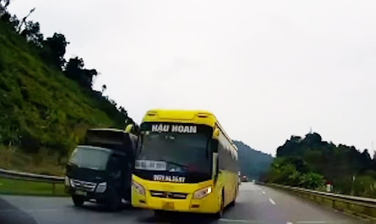 Khoảnh khắc xe khách lần làn vượt ô tô tải trên cao tốc Nội Bài - Lào Cai