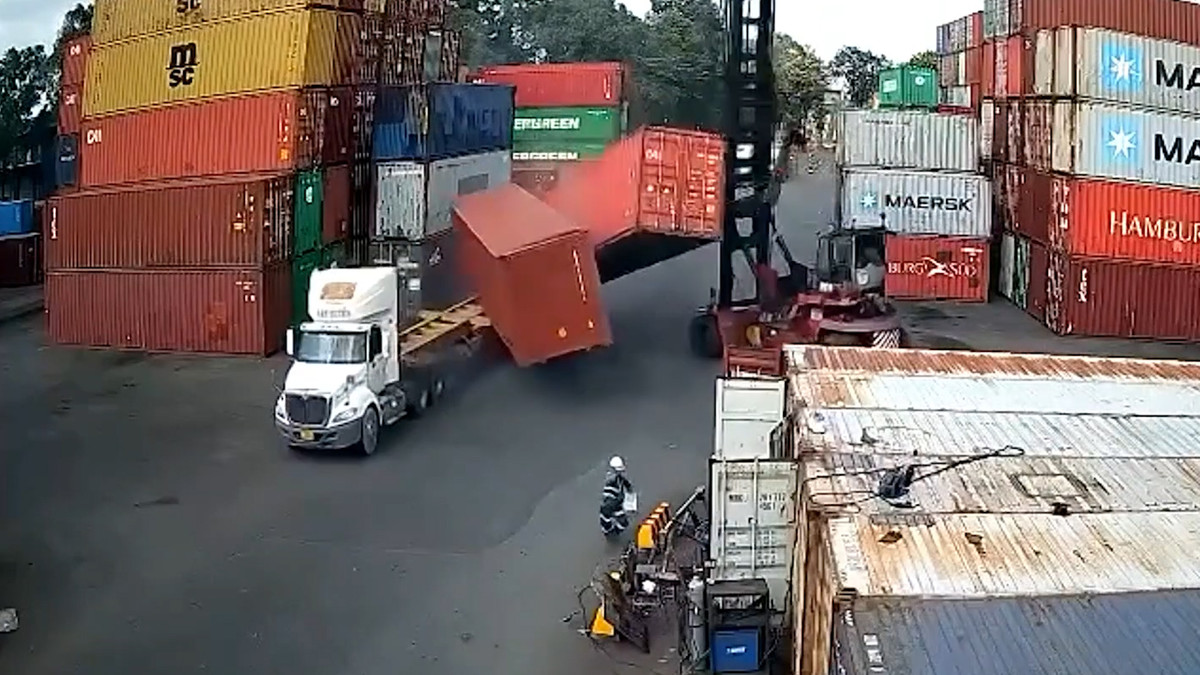Thót tim xe nâng va chạm container, 2 thùng hàng rơi xuống đất