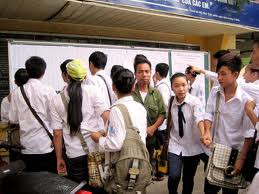 | Thí sinh và người nhà đến xem điểm tại trường THPT Xuân Đỉnh năm 2010 (Ảnh: Phạm Thịnh) |
