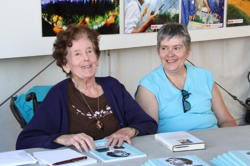Bà Raymonde Dien (bên trái) ký tặng sách về cuộc đời đấu tranh vì hòa bình tại Hội báo Nhân đạo (L'Humanité), ngày 13/9/2014. (Ảnh: nhandan.vn)