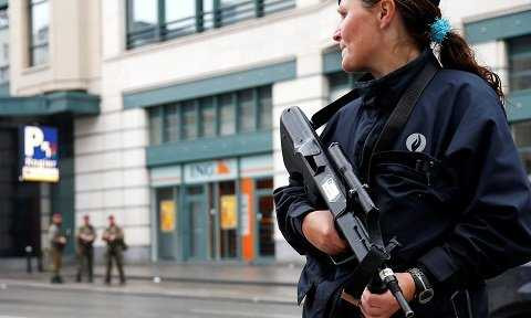 ![]() Một nữ cảnh sát Bỉ canh gác bên ngoài một trung tâm thương mại. (Ảnh: Guardian) |