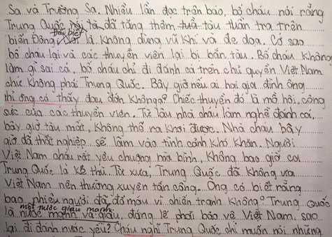 Trung Quốc là một nước giàu mạnh, đáng lẽ phải bảo vệ Việt Nam, sao lại đi đánh nước yếu? Cháu nghĩ Trung Quốc chỉ muốn nói những gì sai sự thật. Cô giáo cháu kể: Trung Quốc tuyên bố Việt Nam là nước láng giềng tốt, theo phương châm “16 chữ vàng” đưa ra năm 1991 và theo tinh thần 4 tốt.