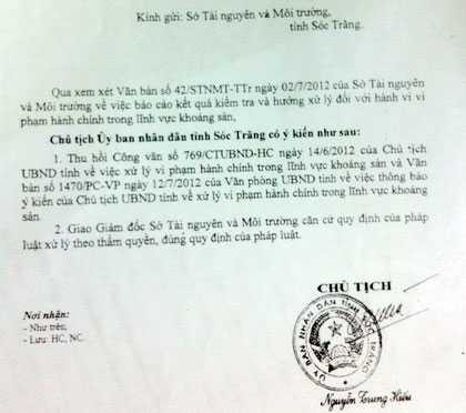 Càng bức xúc hơn khi trước đó một tuần, ngày 8/6/2012 Phó Chánh thanh tra Bộ Tài nguyên Môi trường là ông Tô Văn Đáp có văn bản số 177 đồng quan điểm với hướng xử lý của Giám đốc Sở Tài nguyên Môi trường tỉnh Sóc Trăng là xử lý vụ việc theo hướng phạt tiền là hình phạt chính, phạt bổ sung và biện pháp khắc phục hậu quả là tịch thu tang vật, phương tiện dùng để vi phạm quy định tại tiết b, điểm 6, khoản 3, điều 1 của Nghị định 77 của Chính phủ.