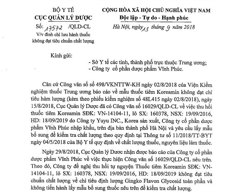 Cục Quản lý Dược yêu cầu, Công ty cổ phần dược phẩm Vĩnh Phúc phối hơp với cơ sở phân phối thuốc, phải gửi thông báo thu hồi tới các cơ sở bán buôn, bán lẻ, sử dụng Thuốc tiêm Koreamin nói trên và tiến hành thu hồi toàn bộ lô thuốc không đạt tiêu chuẩn chất lượng này.