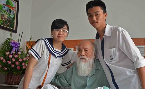 | Thủ khoa Nguyễn Thu Thủy và á khoa Vương Đình Hiếu đến thăm sức khỏe thầy Văn Như Cương. |