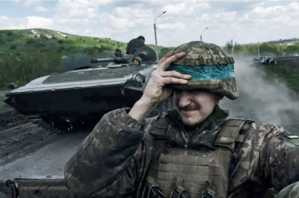 Một người lính Ukraine giữ mũ khi đang trên xe APC ở Bakhmut, vùng Donetsk, Ukraine vào ngày 26/4/2023. (Ảnh: AP)