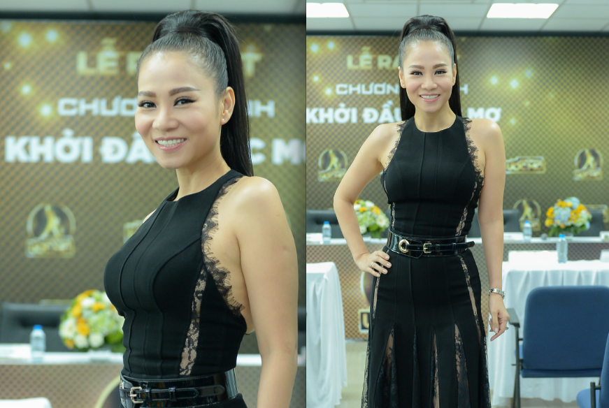 Thu Minh táo bạo diện một trang phục ôm sát với đường ren xuyên thấu chạy dọc thân váy, khoe đường cong sexy.
