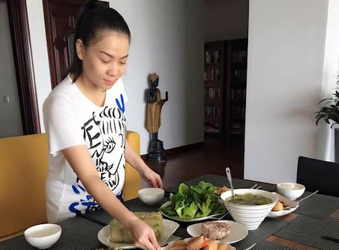 Trong hình, Thu Minh giản dị với áo phông họa tiết đang chuẩn bị bàn tiệc thịnh soạn với các món ăn đa dạng cho 6 người ăn. Theo chia sẻ của Thu Minh thì, nữ ca sỹ chuẩn bị bữa cơm cho buổi họp mặt đầu năm.