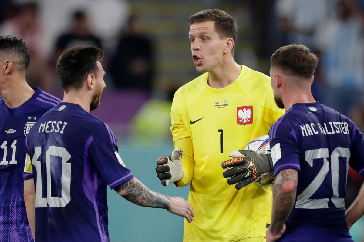 Thủ môn đội tuyển Ba Lan trò chuyện với các cầu thủ Argentina trong lúc chờ trọng tài ra quyết định.