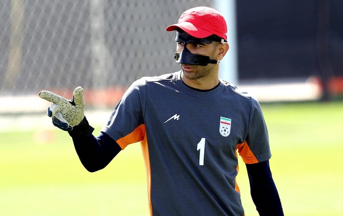 Beiranvand phải đeo mặt nạ trong buổi tập của đội tuyển Iran.