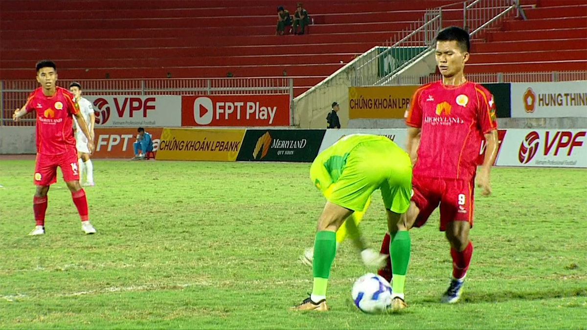 Khoảnh khắc Tiến Tạo định ôm bóng lên, cầu thủ của câu lạc bộ Quy Nhơn United là Đào Gia Việt nhanh chân đá trúng bóng trước. Bóng lọt qua khe giữa 2 chân thủ môn Phú Thọ. Gia Việt sau đó dễ dàng sút vào khung thành trống, ghi bàn mở tỷ số trận đấu.