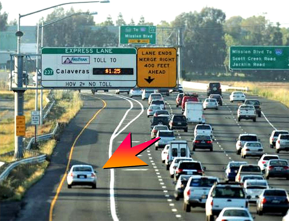 Làn đường nhanh có thu phí - phần đường cạnh vạch vàng, phía dưới biển "Express Lane" - tại California, Mỹ. (Ảnh: Los Angeles Times)