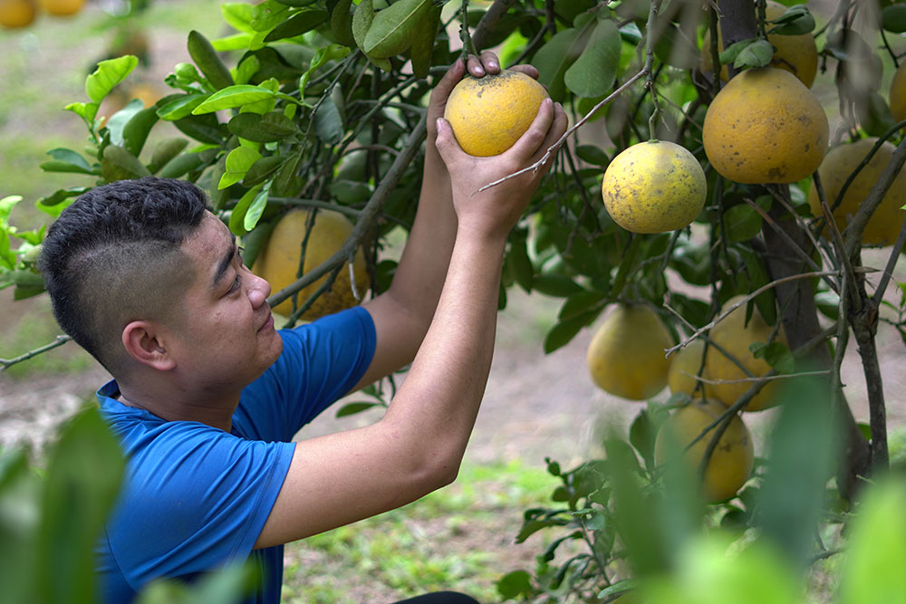 Ngoài những nhân lực chính, anh Phi huy động thêm nhiều người thân để giúp sức. Con trai anh cũng tích cực phân loại và đóng bưởi vào bao tải cho gia đình.