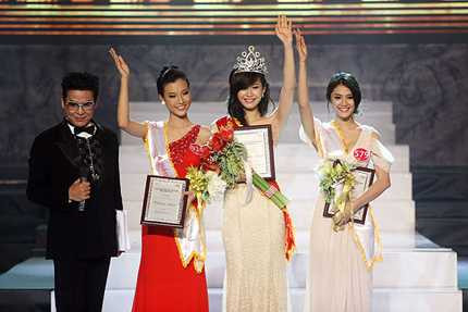| Hoa hậu Phan Thu Quyên (giữa), Á hậu 1 là người đẹp Vũ Ngọc Hoàng Oanh (váy đỏ) và Á hậu 2 Trần Ngọc Linh Chi |