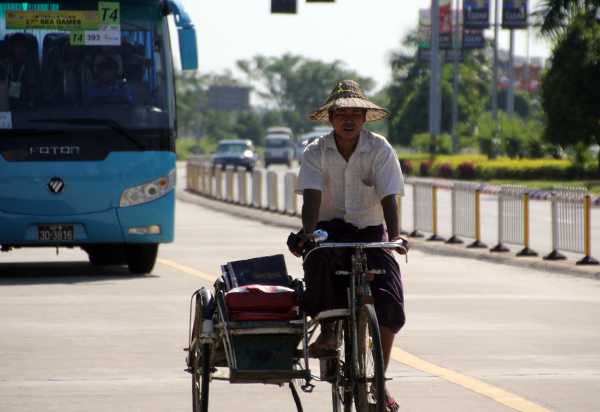 | Một người đạp xe đạp ôm trên đường phố Nay Pyi Taw dưới nắng nóng khó chịu (Ảnh: Hà Thành) |
