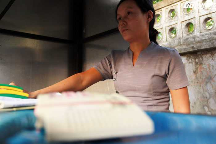 Công việc đơn giản nên chị cũng chỉ cần thêm chiếc bút, cuốn sổ để ghi lại thời gian bắt đầu và kết thúc cuộc gọi, từ đó xác định số tiền mà khách hàng phải thanh toán.