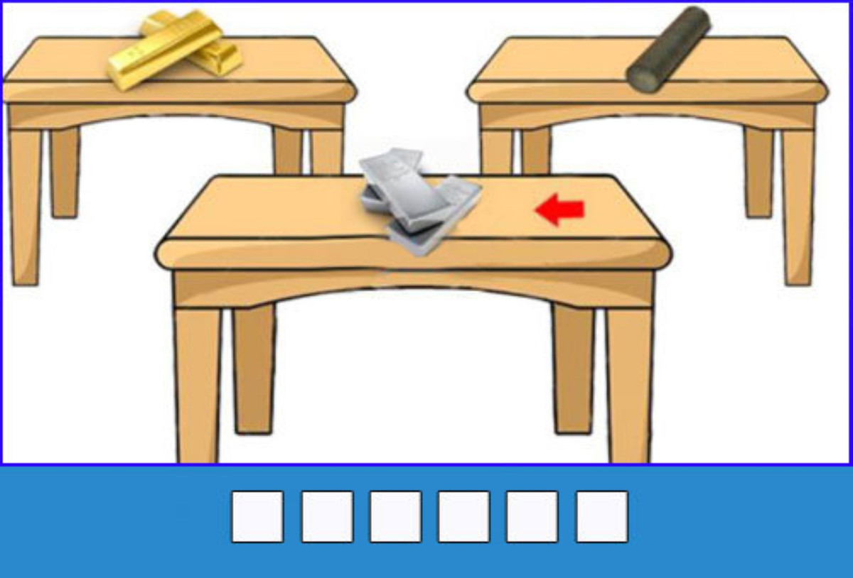 Đuổi hình bắt chữ: Có ba chiếc bàn, trên mỗi chiếc bàn lần lượt đặt, vàng, bạc và chì. Vậy bàn ở mũi tên màu đỏ mô tả chữ gì?