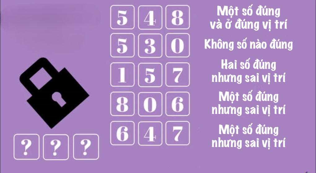 Để mở được ổ khóa bạn cần phải tìm ra 3 số chính xác với những chữ số đã cho trước và các gợi ý bên cạnh gồm: