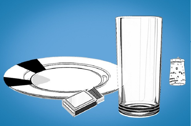 Trên bàn có một chiếc đĩa chứa nước, một cái cốc, một hộp diêm và một nút chai rượu vang như hình vẽ. Thử thách đặt ra là bạn phải khiến nước từ chiếc đĩa chảy vào cốc mà không được chạm tay vào đĩa.