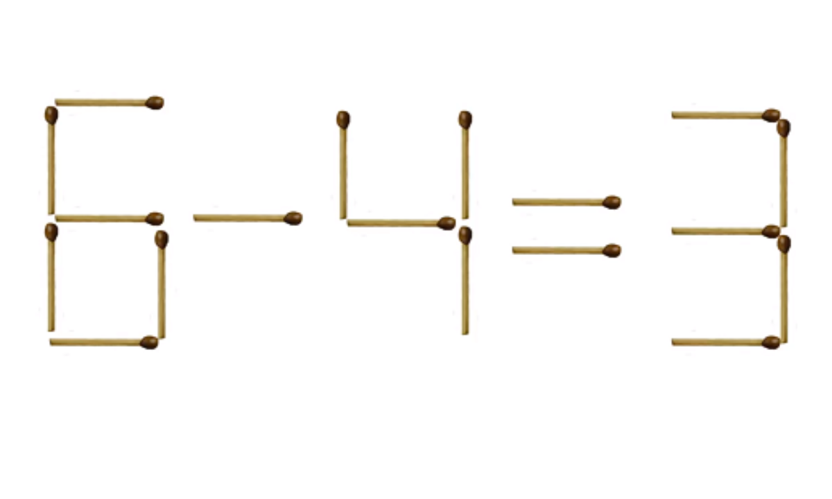 Các que diêm được xếp thành phép tính 6 - 4 = 3 như hình dưới. Bằng trí thông minh bạn hãy thay đổi một que diêm để tạo phép tính đúng.
