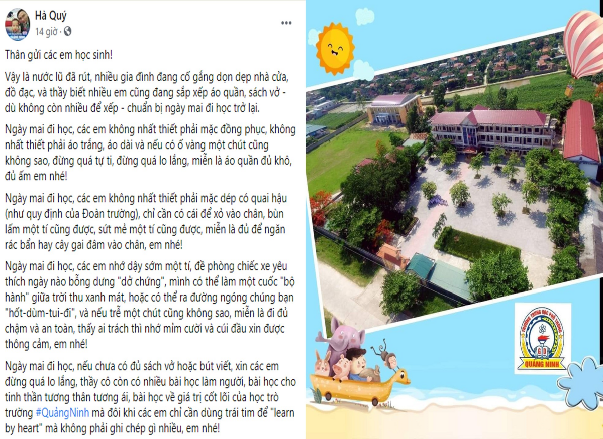 Trong đợt lũ lụt lịch sử vừa qua, huyện Quảng NInh, tỉnh Quảng Bình là một trong những địa phương bị ngập sâu kéo dài. Trường THPT Quảng Ninh cũng nằm trong làn nước. Nước rút, trước hôm thầy trò trở lại trường sau đợt lũ, thầy Hiệu trưởng Hà Quý đã gửi đến các học sinh của mình lá thư với những lời dặn dò đầy yêu thương, thấu hiểu. Ngôn ngữ rất teen và nội dung đầy tình nhân văn của bức thư khiến người đọc xúc động mạnh và nó được lan truyền nhanh chóng, hiện đã có đến 2.000 lượt chia sẻ.