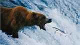 Con gấu lão luyện dùng cặp chân sau quẫy đạp, hất con cá hồi chết lên cao trên mặt nước, rồi dùng mồm nhanh chóng đớp lấy xác con mồi.