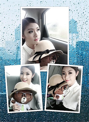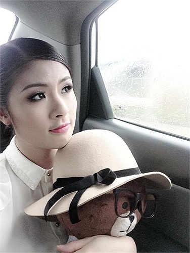 Ngọc Hân trên đường ra máy bay, tranh thủ làm điệu với chú thú bông đáng yêu.