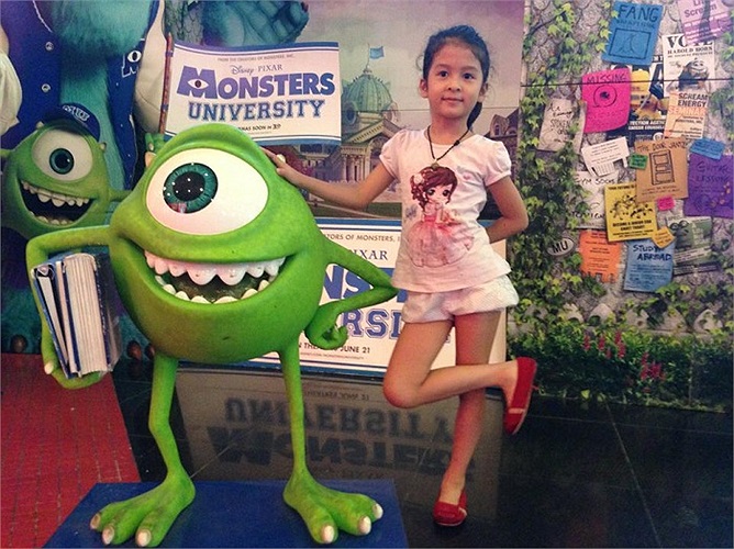 Hai mẹ con làm điệu cho nhau trong lúc chờ phim chiếu.