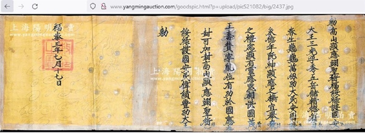 Một trong số các đạo sắc phong được đưa ra đấu giá.