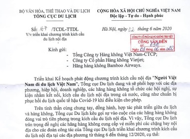 Văn bản số 167/TCDL-TTDL ngày 2/6/2020 do Phó Tổng Cục trưởng Tổng cục Du lịch Việt Nam Hà Văn Siêu ký và gửi tới các hãng hàng không có nội dung: